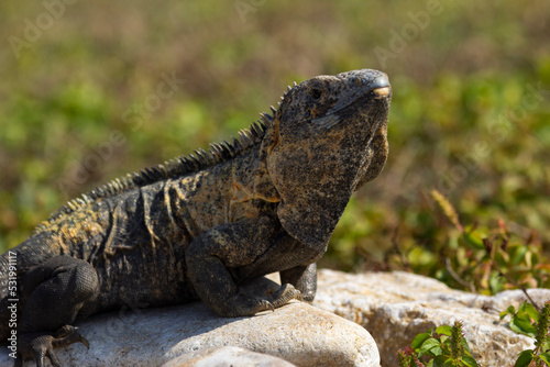 Obraz premium Reptile green iguana is sitting on a rock under the sun