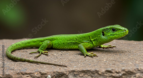 Fototapeta premium Reptile, Reptile skin, Scaled reptile, Vibrant Green Lizard on Rock