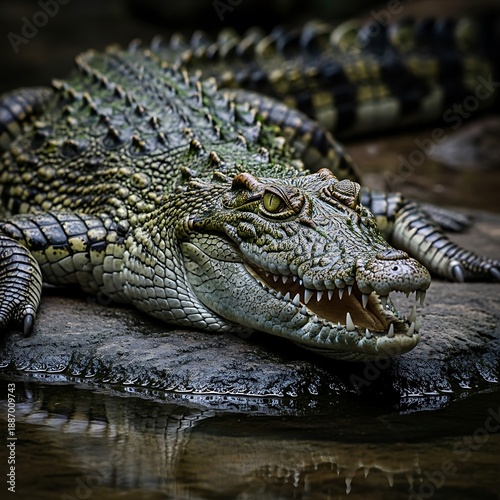 © Madep, Obraz premium Reptilian predator rests near dark water with mouth slightly open revealing sharp teeth