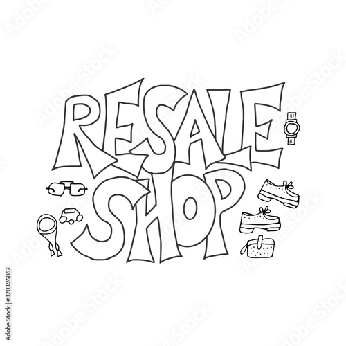 © Syuzann q, Obraz premium Resale shop quote. Message about sale in doodle style