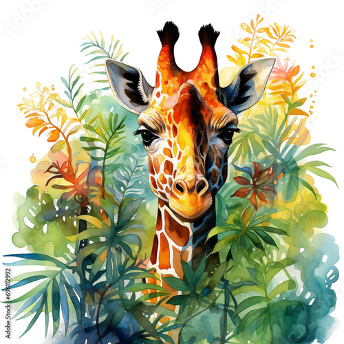 Fototapeta premium Research giraffe in the jungle, clear image, hyper-realistic, bright colourful saturated colours, watercolour, style on a white background, watercolor giraffe, isolated.