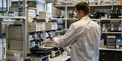 © StudioPix, Obraz premium Researcher in the lab, back view, adjusting settings on a laboratory instrument, hightech lab environment