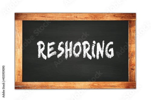 Fototapeta premium RESHORING text written on wooden frame school blackboard.
