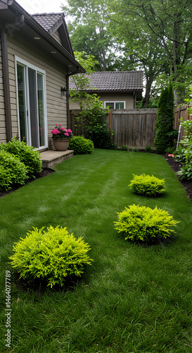 Naklejka premium Residential Backyard Photo Green Lawn Yard Shrubs Plants Outdoor Garden View