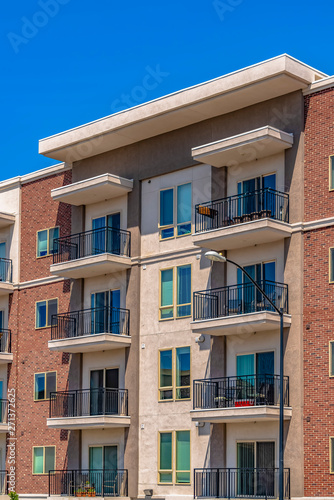 Fototapeta premium Residential building exterior with vivid blue sky background on a sunny day