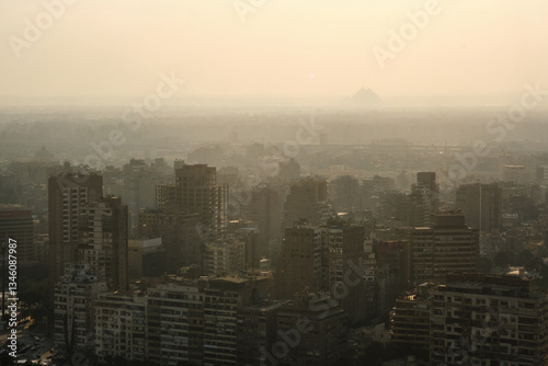 © Philipp Berezhnoy, Fototapeta premium Residential buildings of Cairo and Pyramids of Giza in a haze at background as seen from Cairo TV Tower. Western Cairo and Giza cityscape