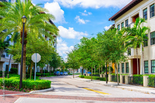 Fototapeta premium Residential housing in Miami Lakes. View down street with street parking on...