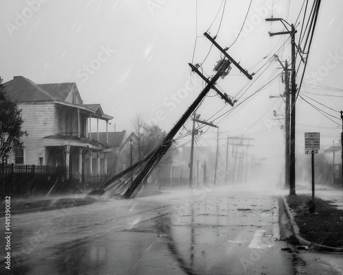 Fototapeta premium Residential Street with Fallen Utility Pole During Heavy Rainfall