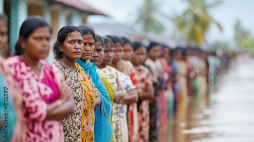 Obraz premium Residents lining up at relief centers for water and food after a flood, Flood Relief, Humanitarian aid