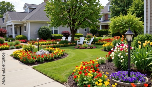 Fototapeta premium Residents take pride in their well manicured gardens and vibrant flower beds, enhancing the charm and beauty of the area while promoting a sense of community pride and connection among neighbors.