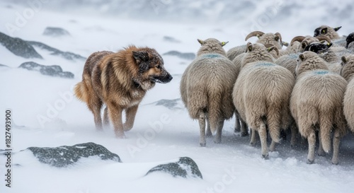 © Vladislav, Fototapeta premium Resilient brown sheepdog with snow-dusted fur carefully herds a flock of woolly sheep during a heavy blizzard in a stark, cold winter landscape