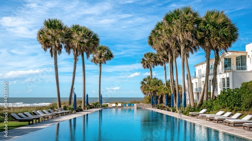 Naklejka premium Resort pool with palm trees, ocean view.