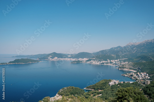Fototapeta premium Resort towns along the coast of the Bay of Kotor at the foot of the green...