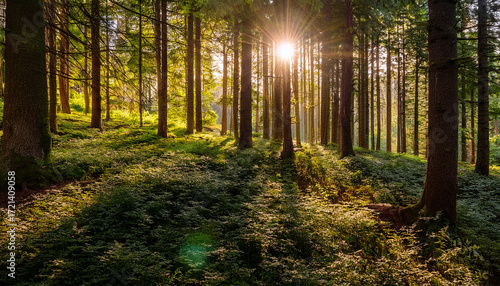 © Kael, Fototapeta premium Resplendent Sunlight Pours Through Towering Trees In A Vibrant Forest Domain