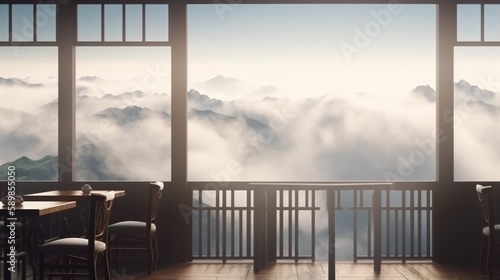 Fototapeta premium Restaurant balcony corner mountain view thick foggy clouds. Generative Ai.
