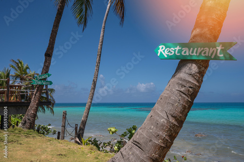 © PixieMe, Fototapeta premium Restaurant sign arrow on palm tree