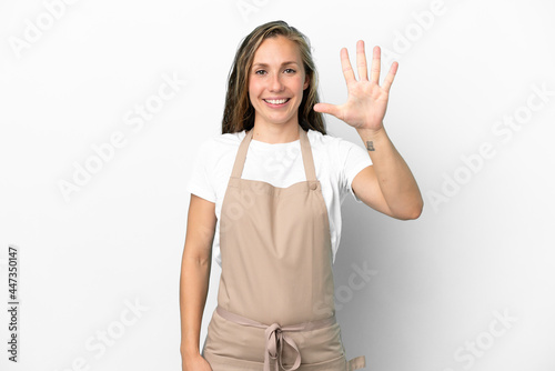 Fototapeta premium Restaurant waiter caucasian woman isolated on white background counting five with fingers