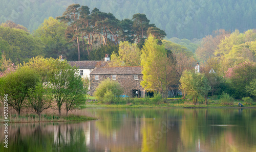 © Simon, Fototapeta premium Restful image of a farmhouse on a still dawn by the lake