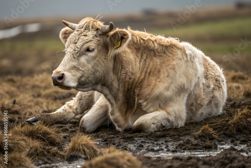 © Photo Hub, Fototapeta premium "Resting Cow Lying on Muddy Farm Field – Peaceful Rural Scene in Countryside"