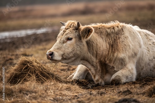 © Photo Hub, Fototapeta premium "Resting Cow Lying on Muddy Farm Field – Peaceful Rural Scene in Countryside"