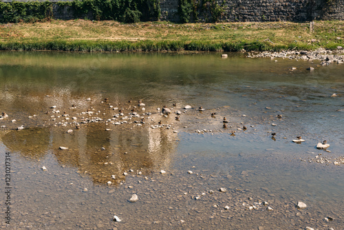Fototapeta premium Resting ducks are perched on rocks in a shallow river, while the clear water reflects a stone building under the bright sun, creating a tranquil and picturesque scene. Animal, summer