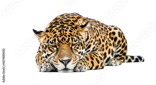 © adzka10, Obraz premium Resting Jaguar Portrait on White Backdrop Showcasing its Distinctive Spotted Coat and Peaceful Demeanor Expressing Serenity in the Wild