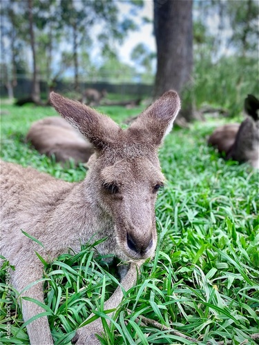 © Heavenlyflower, Fototapeta premium Resting Kangaroo on Green Grass – Australian Wildlife in Natural Setting