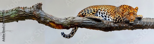 © Amonthep, Obraz premium Resting Leopard A leopard lounging on a branch with a white background