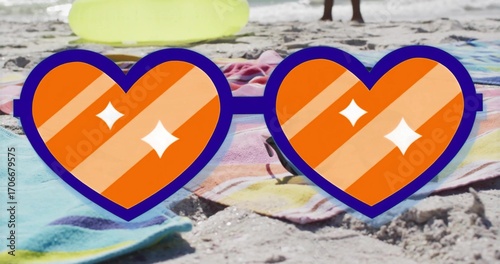 Fototapeta premium Resting novelty heart-shaped sunglasses on pastel beach towels at shoreline,...