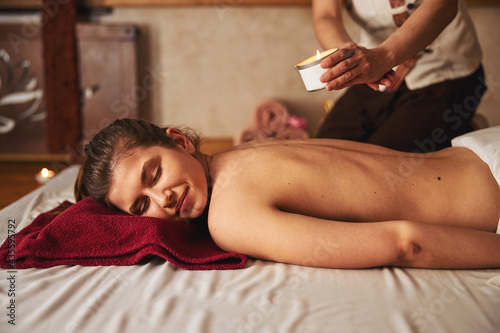 © Svitlana, Fototapeta premium Resting woman with massage candle turned over her back