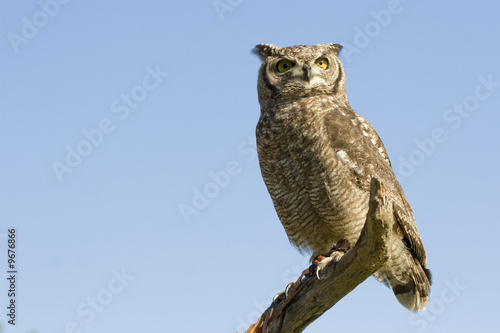 Fototapeta premium reticulated eagle owl over blue sky with copy space