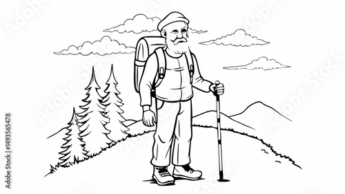 © Margo Miro, Naklejka premium Retired man hiking with excitement and exploration in a detailed line art illustration