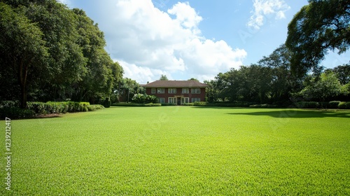 © Lion, Fototapeta premium Retirement home exterior with colonial-style architecture, well-manicured lawns and a sunny day, serene and welcoming environment