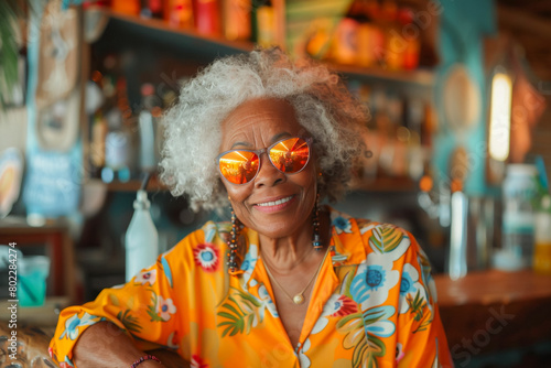 Obraz premium Retirement person at a beach bar, relishing in the leisure of a sunny holiday.
