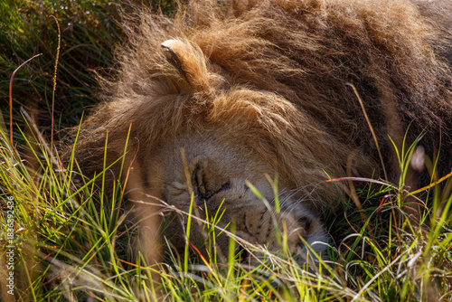 © DavidEnFoco, Fototapeta premium Retrato de Primer Plano de León Macho Alfa con Melena Espectacular en el Pastizal Africano de Kenia