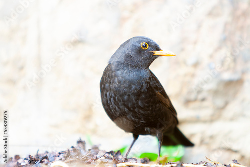 Obraz premium Retrato de un mirlo (turdus merula) macho en un jardín