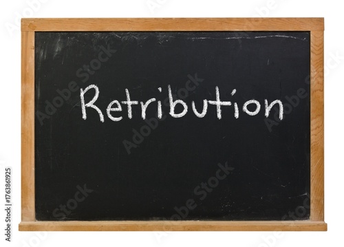 Obraz premium Retribution written in white chalk on a black chalkboard isolated in a wooden...