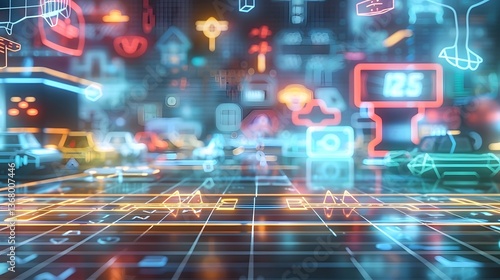 © watchirachat, Obraz premium Retro arcade gaming pattern with pixelated characters glowing joysticks and neon grid lines creating a fun and nostalgic futuristic digital artwork