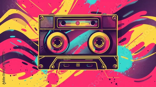 Fototapeta premium Retro audio cassette illustration with vibrant neon colors and abstract...