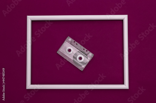 Fototapeta premium Retro audio cassette on purple background with white frame. Top view