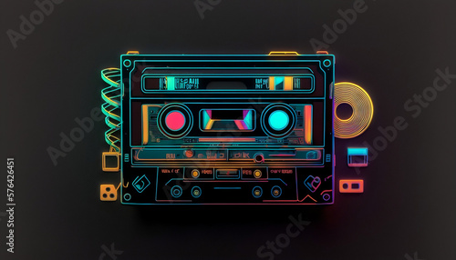 Fototapeta premium Retro audio cassette tape for cassette recorder, neon light, 80s-90s style,...