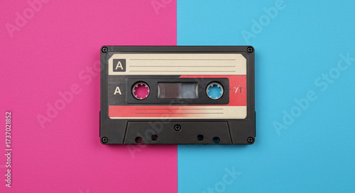 Fototapeta premium Retro audio cassette tape on a vibrant pink and blue background