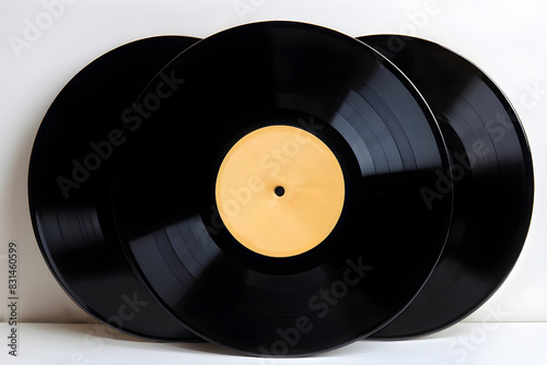 Obraz premium Retro black vinyl records trio with yellow label, on white background