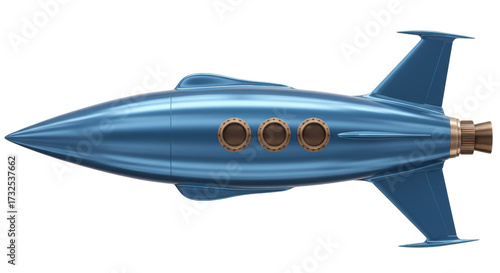 © Thomas, Fototapeta premium Retro blue rocket ship isolated, vintage space travel concept for science fiction and aerospace design PNG