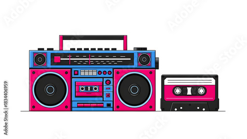 Obraz premium Retro Boombox with Cassette Tape Illustration: Vintage Music Player, 80s Nostalgia, Audio Technology, Entertainment