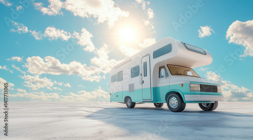 Naklejka premium Retro Campervan Road Trip: A vintage-style campervan, painted in pastel teal and white, cruises across a sun-drenched landscape, promising adventure and freedom on the open road.