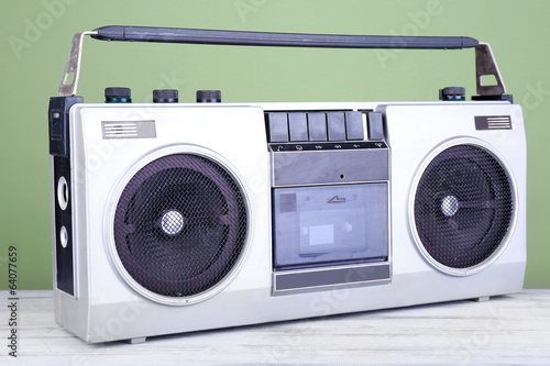 © Africa Studio, Obraz premium Retro cassette stereo recorder on table on green background