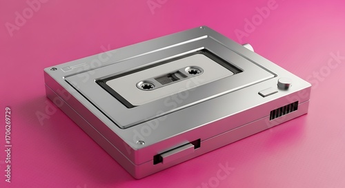 © ROSARIO, Obraz premium Retro Cassette Tape, Modern Metal Housing, Pink Background.