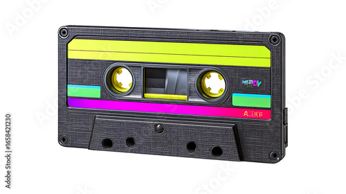 Fototapeta premium Retro cassette tape with neon-colored label, isolated on a white background.