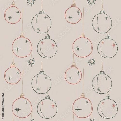 © NoelMatic, Naklejka premium Retro Christmas seamless pattern background featuring delicate hand-drawn line art sketches of festive holiday baubles and sparkling stars.